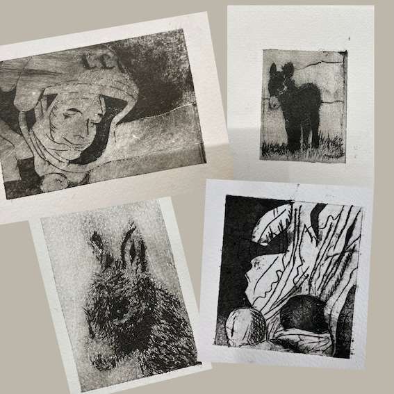 Anfangs kopierte ich Gemäldeausschnitte auf Papier und übertrug die Grundlinien mit Kohlepapier auf die Platte (Tetrapak, später Zink), später half eine Tracing-App. Manches vereinfachte ich, weil nicht alles 1:1 aus einem Gemälde in die Radierung passte. Schon gar nicht, wenn man in sehr kleinen Formaten arbeitete. Das Tracen der Linien erleichterte den Prozess erheblich.