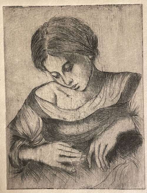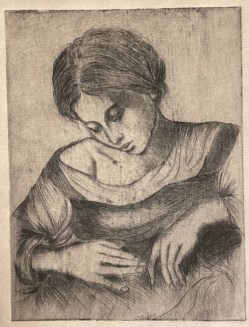 Kaltnadelradierung auf Zink, 9 × 7,5 cm, Adaption, Detail der Jungfrau Maria aus Caravaggios Geburt Christi mit den Heiligen Laurentius und Franziskus, 1609 —