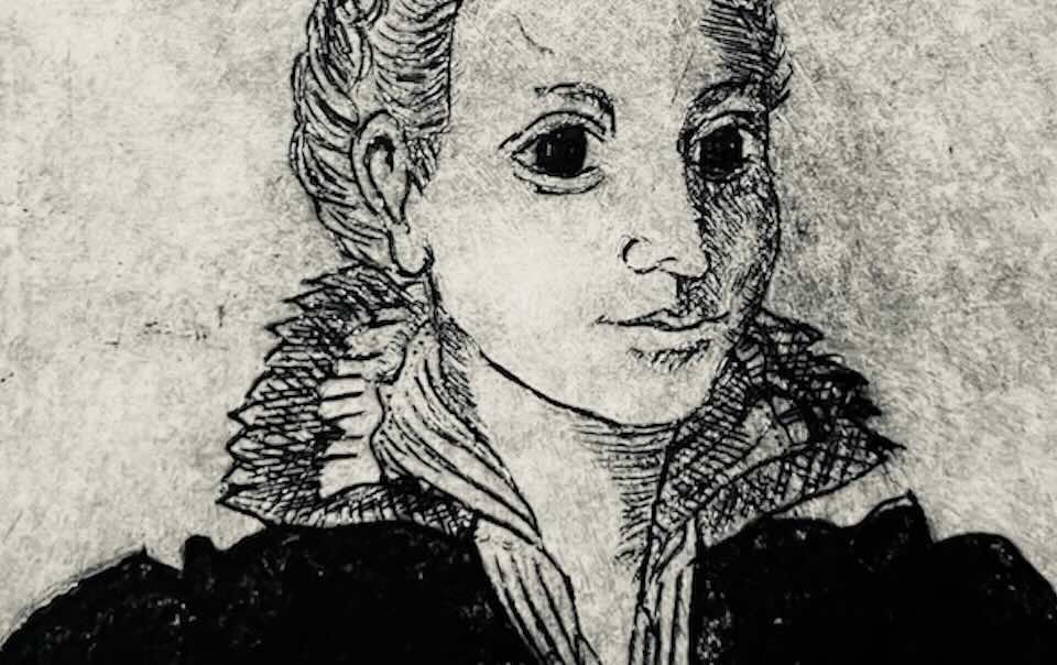 Tetrapak-Cutout-Druck, Adaption, Sofonisba-Serie 02, Elisabeth von Valois, Porträt nach Sofonisba Anguissola, ca. 1565 – Die Cut-Out-Druckplatte erinnerte mich an Anziehpuppen aus Papier, und ich experimentierte nochmal mit Monoprint-Hintergründen, stilistisch irgendwo zwischen Renaissance und 19. Jahrhundert,…